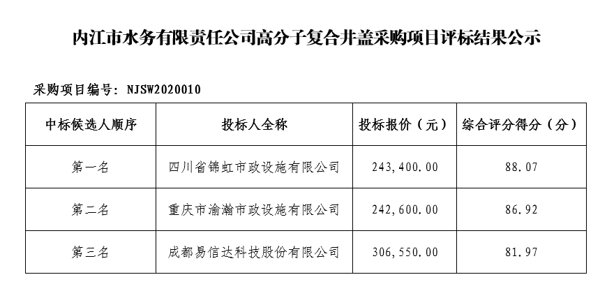 內(nèi)江市水務(wù)有限責(zé)任公司高分子復(fù)合井蓋采購(gòu)項(xiàng)目評(píng)標(biāo)結(jié)果公示