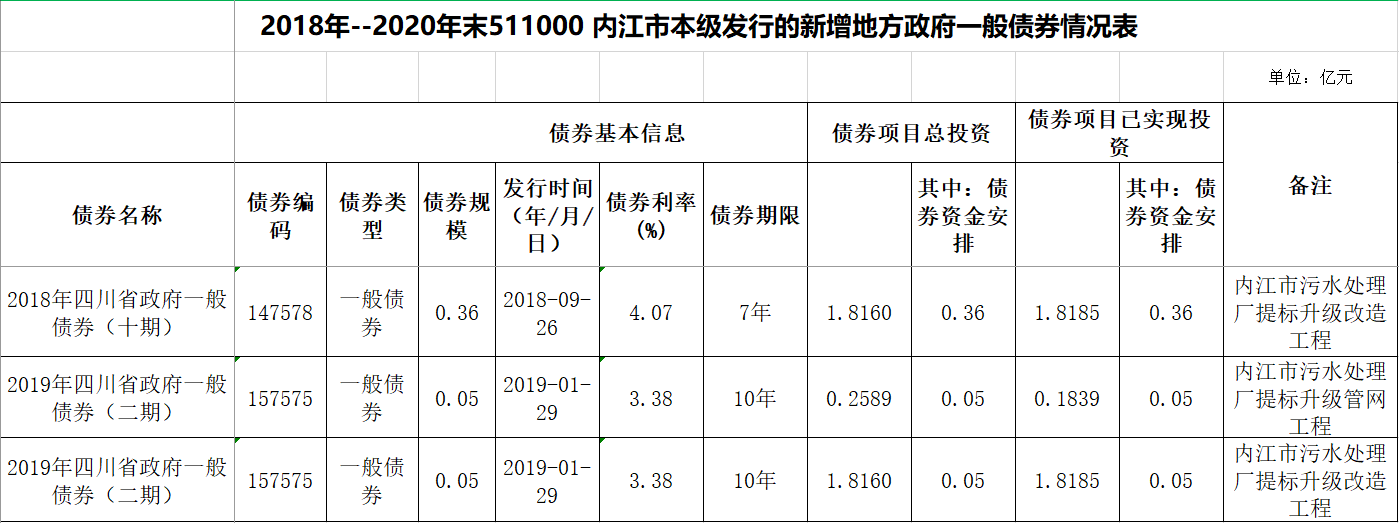 2018年-2020年末511000內(nèi)江市本級發(fā)行的新增地方政府一般債券情況表