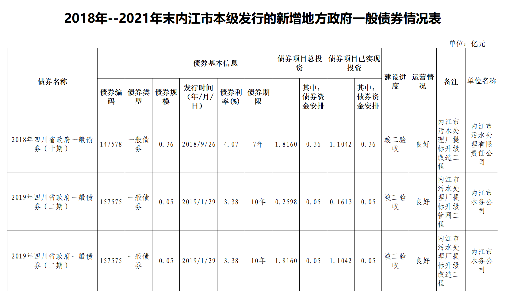 2018年--2021年末內(nèi)江市本級(jí)發(fā)行的新增地方政府一般債券情況表