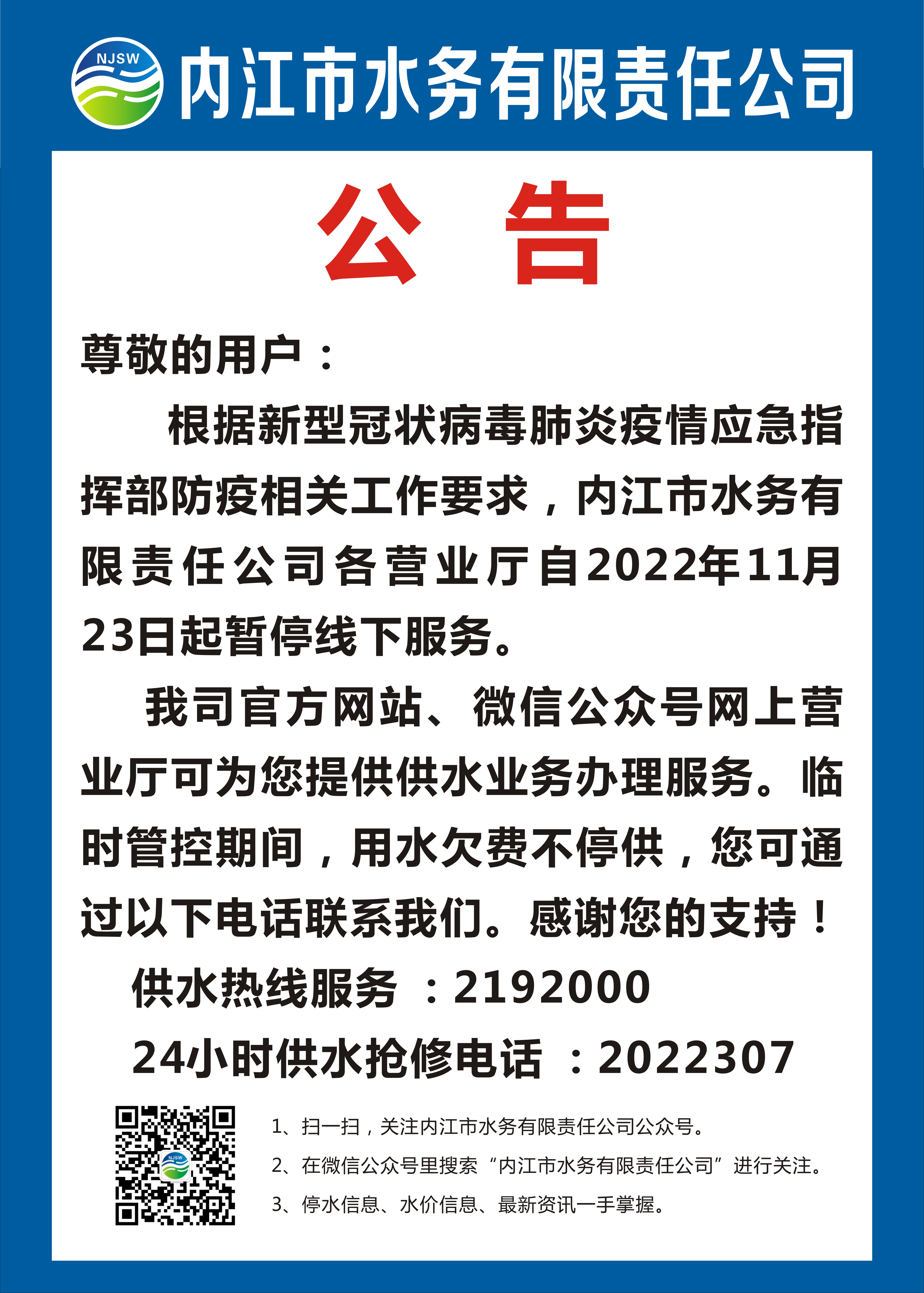 內(nèi)江市水務(wù)有限責(zé)任公司疫情防控公告