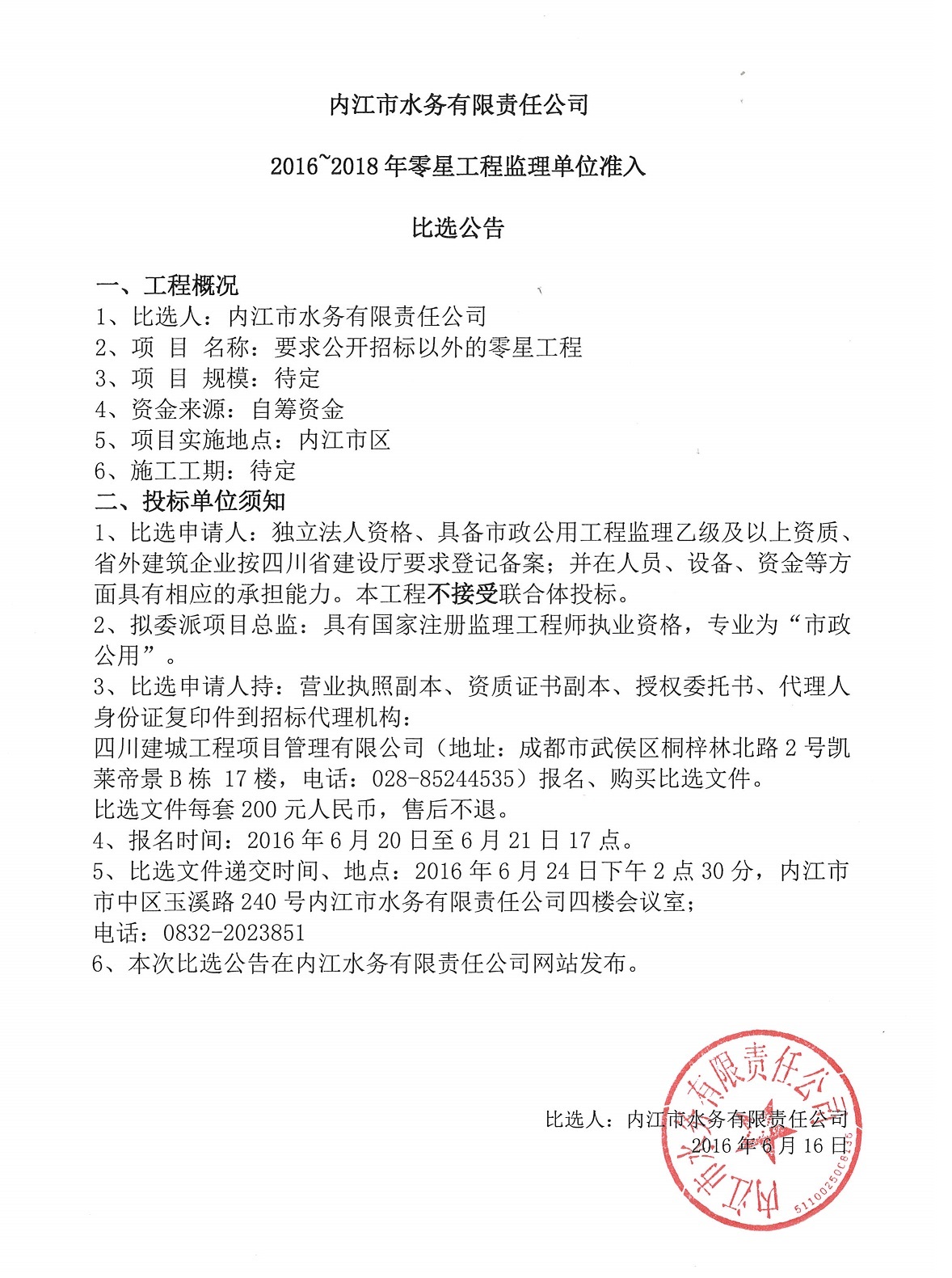 內江市水務有限責任公司2016~2018年零星工程監理單位準入比選公告