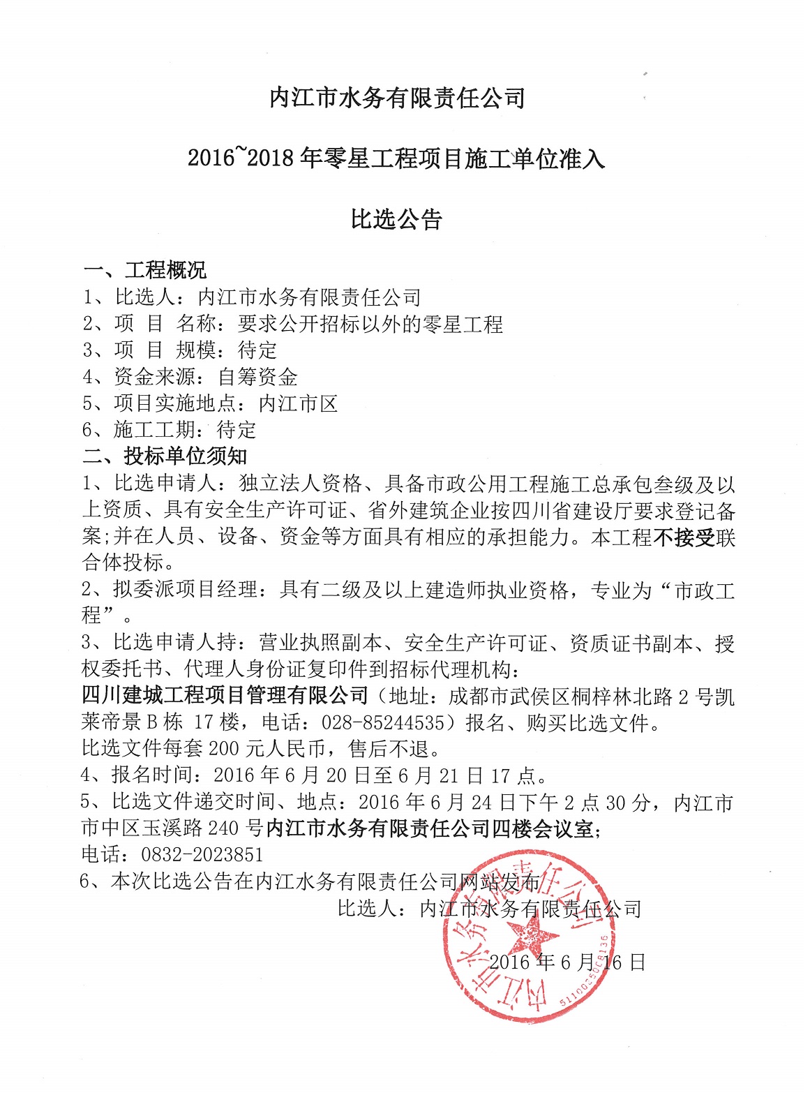 內(nèi)江市水務(wù)有限責(zé)任公司2016~2018年零星工程項(xiàng)目施工單位準(zhǔn)入比選公告