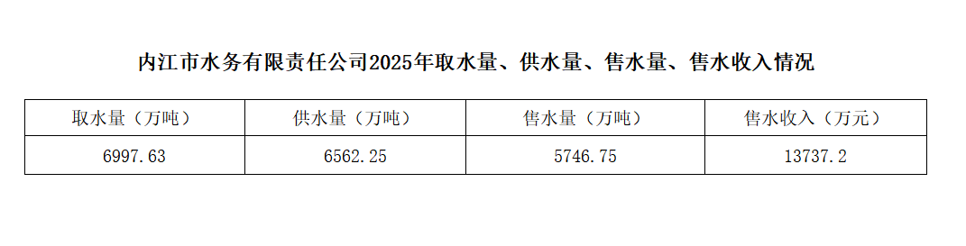 內江市水務有限責任公司2025年取水量、供水量、售水量、售水收入情況