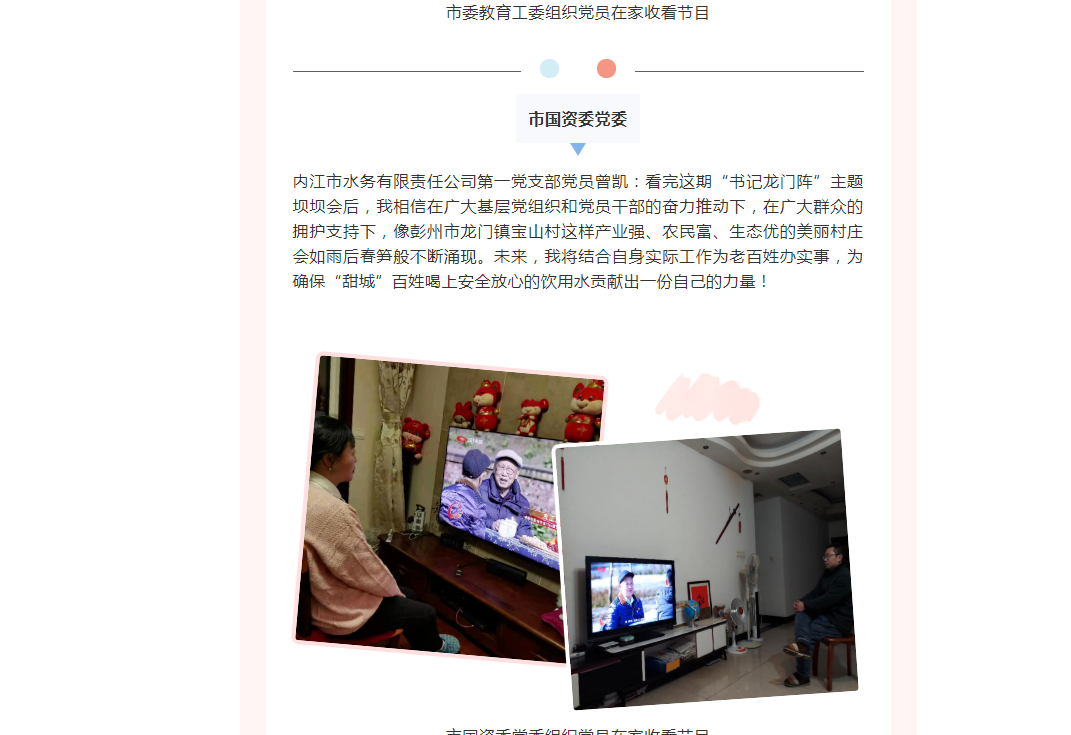 六個黨支部高度重視、立即行動,在周六晚上7:50準時組織黨員收看節目,并在內江水務黨務微信群里把收看照片和觀后感進行分享,大家積極踴躍,學習氣氛熱烈。