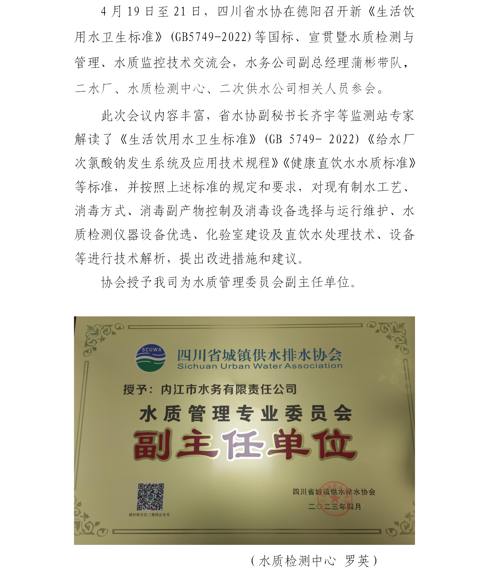 內江市水務公司獲省水協授予水質管理專業委員會副主任單位