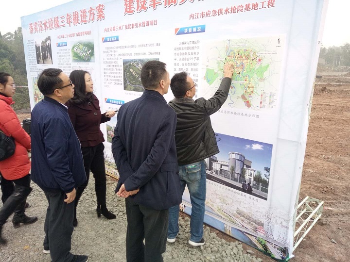 1128日,省環境保護廳副巡視員姚東升一行到內江,對落實污水垃圾三年推進方案落實情況進行調研。調研組先后來到了桐梓壩大橋至壽溪河口綜合環境整治工程、謝家河黑臭水體整治、東興區垃圾壓縮站及環衛車輛專用停車場,最后來到我司第二污水處理廠建設施工現場進行實地調研。公司黨委副書記、紀委書記、工會主席李濤在《落實污水垃圾三年推進方案,建設幸福美麗內江》展板前對項目推進情況作了詳細匯報,并報告了下一步工作計劃。